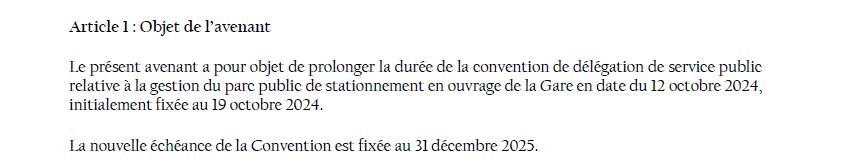 Lors du conseil municipal du 13 novembre 2025 (extrait vidéo), le maire sortant affirme qu’« on ne pouvait pas juridiquement reporter la DSP des parkings ».Pourtant, il suffit de relire la délibération du 27 juin 2024 : la Ville y a validé un avenant prolongeant la DSP du parking de la gare jusqu’au 31 décembre 2025, alors qu’elle devait initialement s’arrêter le 19 octobre 2024.